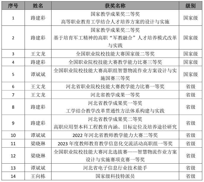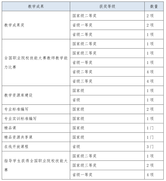 获全国职业院校技能大赛教师教学能力比赛国家级二等奖1项,国家级三等奖1项,省级一等奖1项、省级二等奖4项、省级三等奖4项;