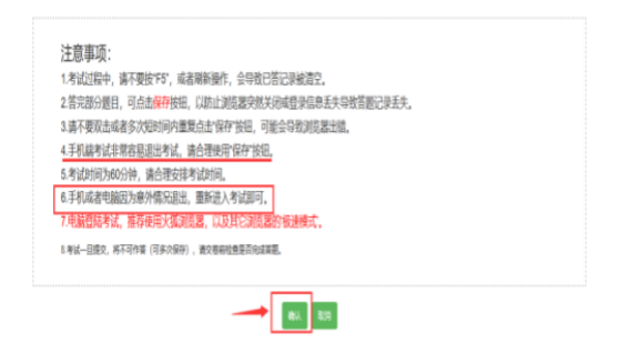 6. 查看注意事项,点击绿色“确认按钮”开始考试
