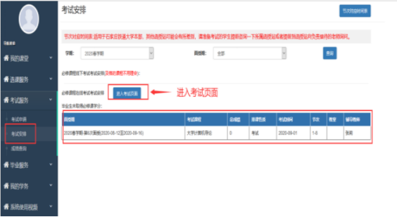 4. 在左侧任务栏先点击考试安排,在点击右侧蓝色按钮“进入考试页面”