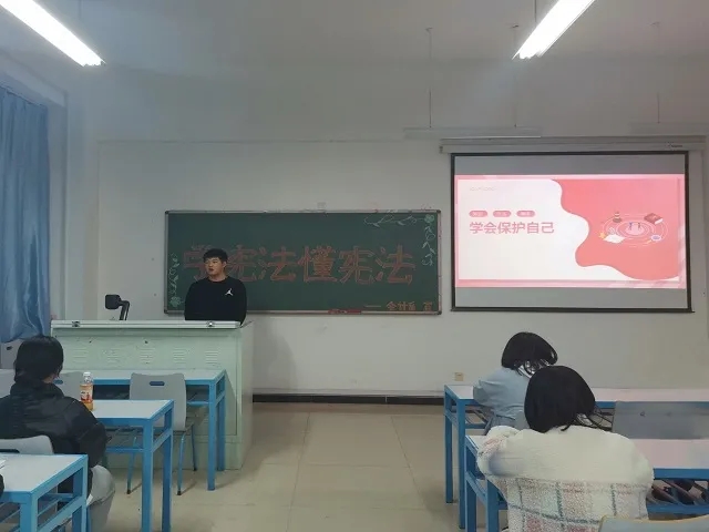 安全铭记于心,文明伴随我行。为深入学习贯彻习近平总书记关于加强宪法法治宣传教育的重要指示精神,增强学生法律意识,不断弘扬宪法精神。12月2日晚七点,我系于B516教室开展“学宪法,懂宪法”道德讲堂。此次道德讲堂由刘赛同学主持,21级学生代表到场参加。