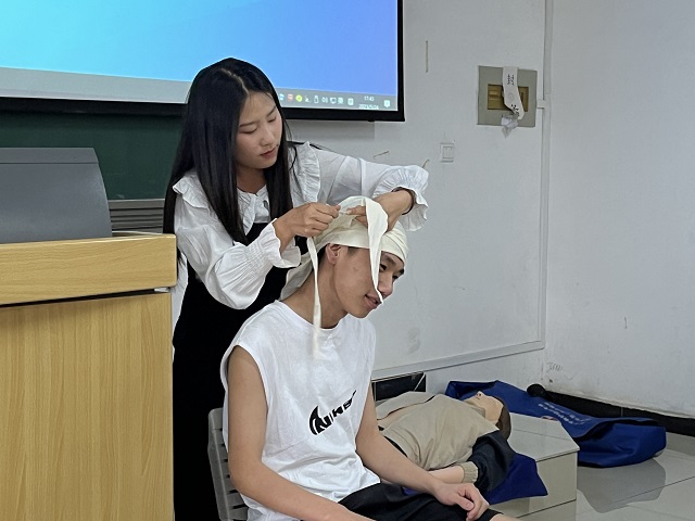 随后,李佳老师进一步普及外伤急救四项基本技术知识,其中包括流鼻血止救方式、头部腿部包扎、烧伤处理、冻伤处理。首先纠正了流鼻血止救中仰头止血的错误方式,提醒同学们应身体微前倾以局部压迫的方式止血。期间老师们以三角巾包扎法为例,展示了头部、手部、腿部的包扎方法。示例应把三角巾底边朝前,折叠起两横指宽,放在患者前额齐眉处。把两侧底角,经耳后上方往后收,在枕部交叉绕到前额,在眉毛上方打结,然后拉紧顶角,把三角巾折叠后塞入两底角交叉处。对于不同程度的烧伤和冻伤,老师们分别讲述了应对方法。在烧伤时主要用流水冲洗至敷料覆盖,冻伤时用温水或衣物包裹,使身体复温,稳定患者情绪后尽快送往医院治疗。