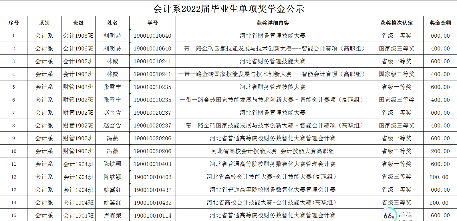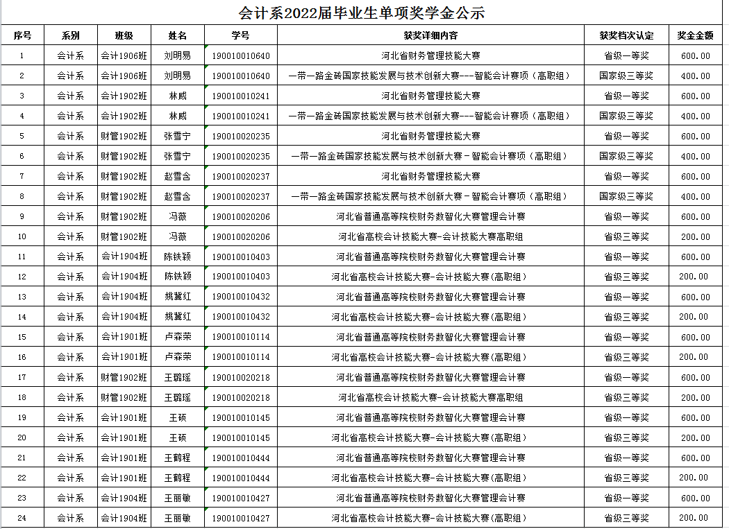 会计系2022届毕业生单项奖学金、技能竞赛奖学金与优秀学生奖学金公示