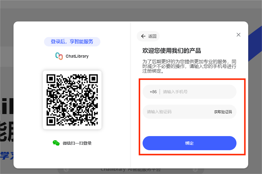首次登录ChatLibrary AI智能服务平台,需进行微信绑定、手机号绑定,具体流程如下: