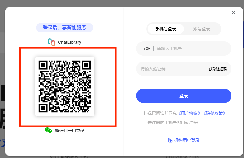 (1)打开ChatLibrary AI智能服务平台,点击右上角的“登录/注册”按钮,弹出登录框。