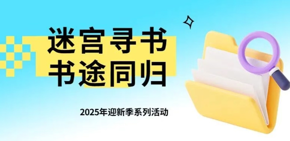 迷宫寻书 书途同归 一场超好玩的图书解谜大冒险! 每天解锁一个新书线索, 像侦探一样在书海中寻宝, 最后还能拼图赢奖、分享读书快乐~ 让你轻松爱上阅读, 交到志同道合的书友! 活动详情 01活动时间:9月21日—30日 02 参与方式&兑奖规则 ✨闯关攻略 1️⃣图书馆二层大厅活动海报中有九张书籍迷宫图,任选其一即可参与游戏(每张含6本神秘书籍) 2️⃣ 连续6天解锁挑战: ✦ Day1-Day6 每日9:00活动海报更新1本关键词提示...