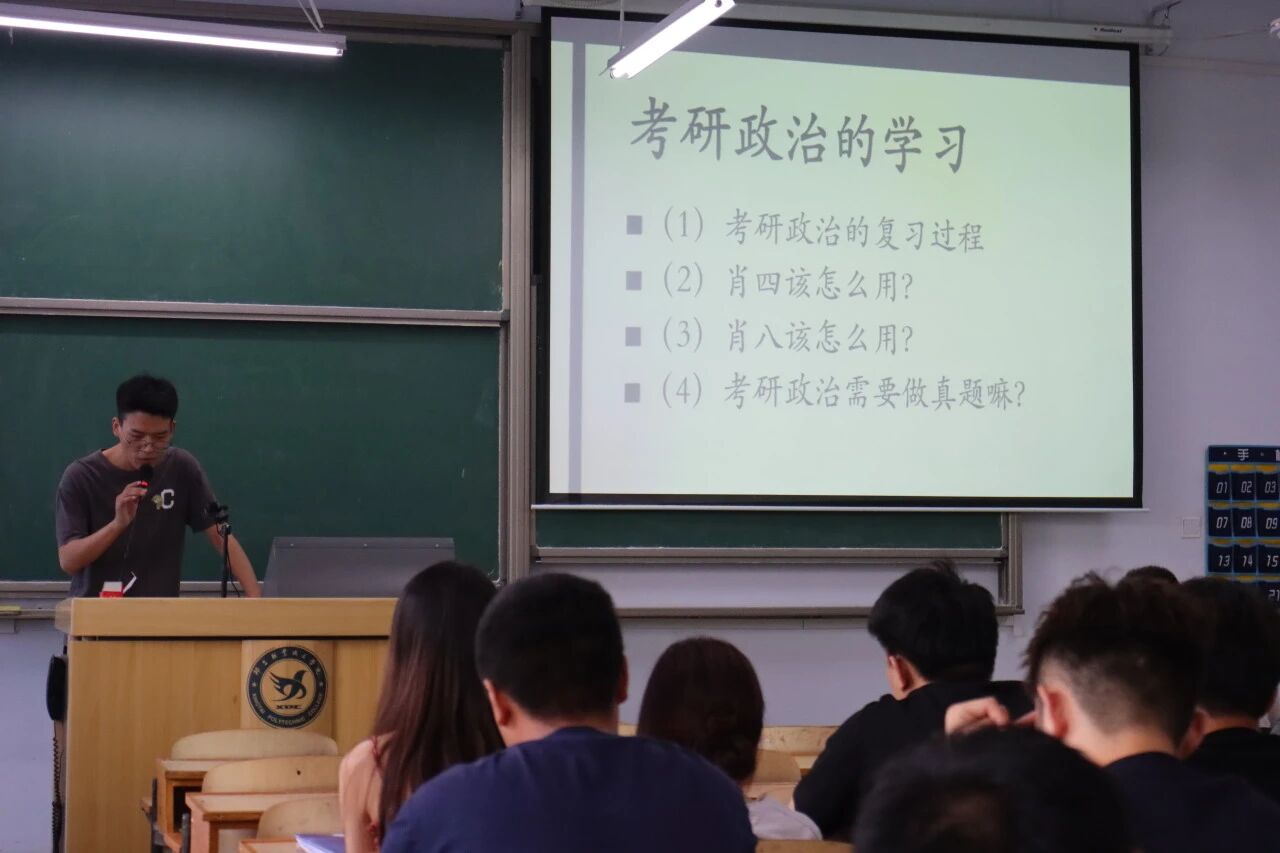 本次交流会分为四个主题,主要为考研择校经验、时间安排、数学与英语学习、政治与专业课学习。主讲学生代表根据自身考研经历,层层分析,深入浅出,他们首先从考研目的、考研现状和择校原则进行细致的讲解。
