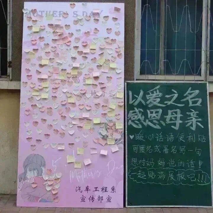 我系制作了“母亲节”主题展板,组织同学们匿名或署名在生活区三号楼下写下了一张张对母亲诉说爱意的便利贴。这些便利贴上的语言简洁朴实,却蕴含着对母亲的浓浓爱意。被填满的展板代表着我系学子们对母亲的感恩之心。