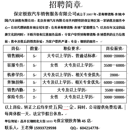 保定极致汽车销售服务有限公司招聘顾问、客服专员等