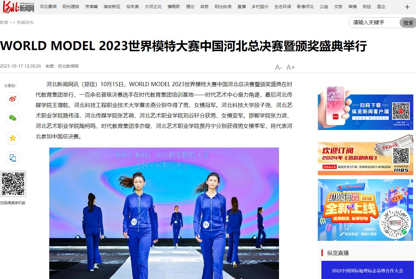 河北新闻网讯(郑佳)10月15日,WORLD MODEL 2023世界模特大赛中国河北总决赛暨颁奖盛典在时代教育集团举行,一百余名晋级决赛选手在时代教育集团培训基地——时代艺术中心奋力角逐,最后河北传媒学院王增乾、365上市公司官网夏志燕分别夺得了男、女模冠军。河北科技大学段子尧、河北艺术职业学院路伟泽、河北传媒学院张艺萌、河北艺术职业学院刘谷轩分获男、女模亚军。邯郸学院张力波、河北艺术职业学院陶柯鸣、时代教育集团李亦璇、河北艺术职业学院贾丹宁分别获得男女模季军,将代表河北参加中国总决赛。