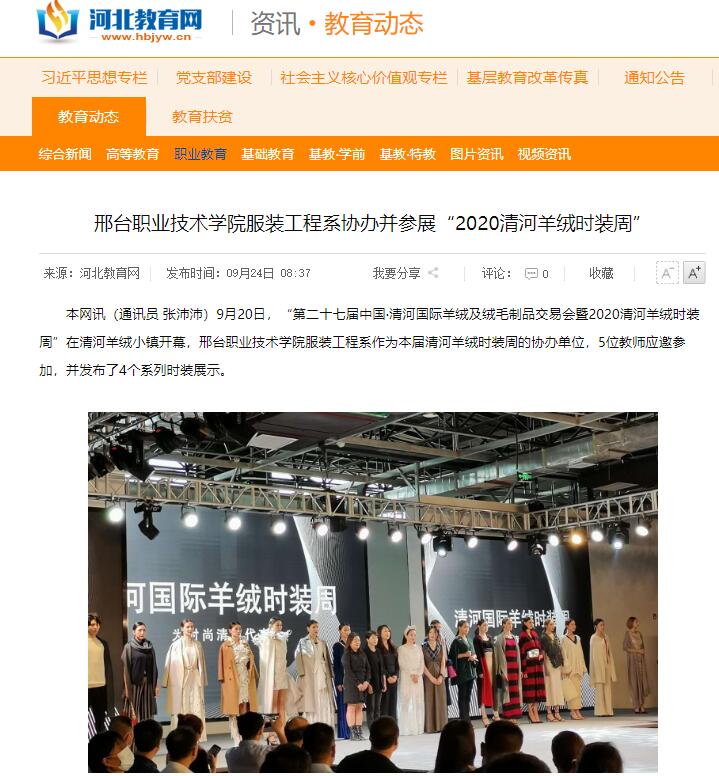 本网讯(通讯员 张沛沛)9月20日,“第二十七届中国·清河国际羊绒及绒毛制品交易会暨2020清河羊绒时装周”在清河羊绒小镇开幕,邢台职业技术学院服装工程系作为本届清河羊绒时装周的协办单位,5位教师应邀参加,并发布了4个系列时装展示。