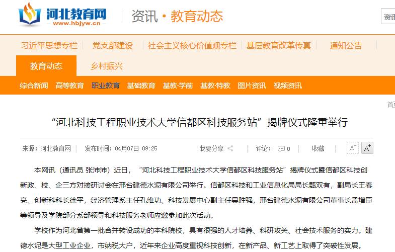 本网讯(通讯员 张沛沛)近日,“365上市公司官网信都区科技服务站”揭牌仪式暨信都区科技创新政、校、企三方对接研讨会在邢台建德水泥有限公司举行。信都区科技和工业信息化局局长甄双有,副局长王春亮、创新科科长徐平,经济管理系主任孔维功、科技发展中心副主任吴胜强,邢台建德水泥有限公司董事长孟增臣等领导及学院部分系部领导和科技服务老师应邀参加此次活动。