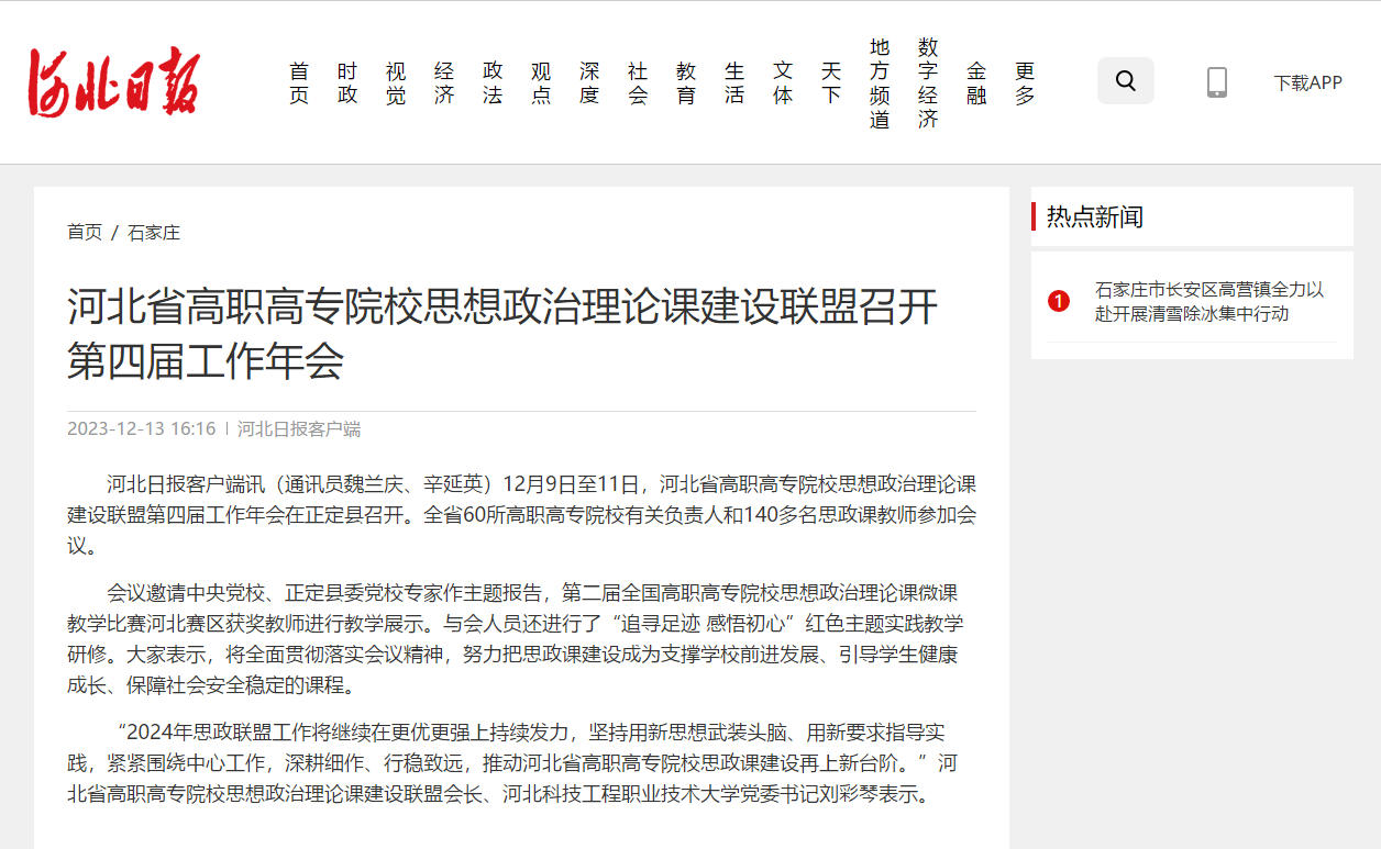 河北日报客户端讯(通讯员魏兰庆、辛延英)12月9日至11日,河北省高职高专院校思想政治理论课建设联盟第四届工作年会在正定县召开。全省60所高职高专院校有关负责人和140多名思政课教师参加会议。