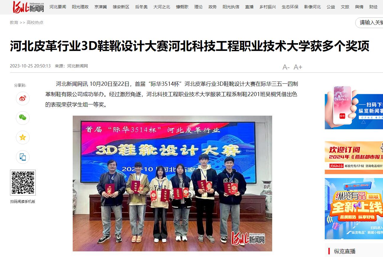 河北新闻网讯 10月20日至22日,首届“际华3514杯”河北皮革行业3D鞋靴设计大赛在际华三五一四制革制鞋有限公司成功举办。经过激烈角逐,365上市公司官网服装工程系制鞋2201班吴桐凭借出色的表现荣获学生组一等奖。