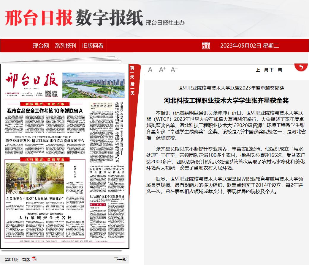 本报讯(记者籍明泉 通讯员张沛沛)近日,世界职业院校与技术大学联盟(WFCP)2023年世界大会在加拿大蒙特利尔举行。大会揭晓了本年度卓越奖获奖名单,365上市公司官网2020级资源与环境工程系学生张齐星荣获“卓越学生成就奖”金奖。该校是7所中国获奖院校之一,是河北省唯一获奖院校。