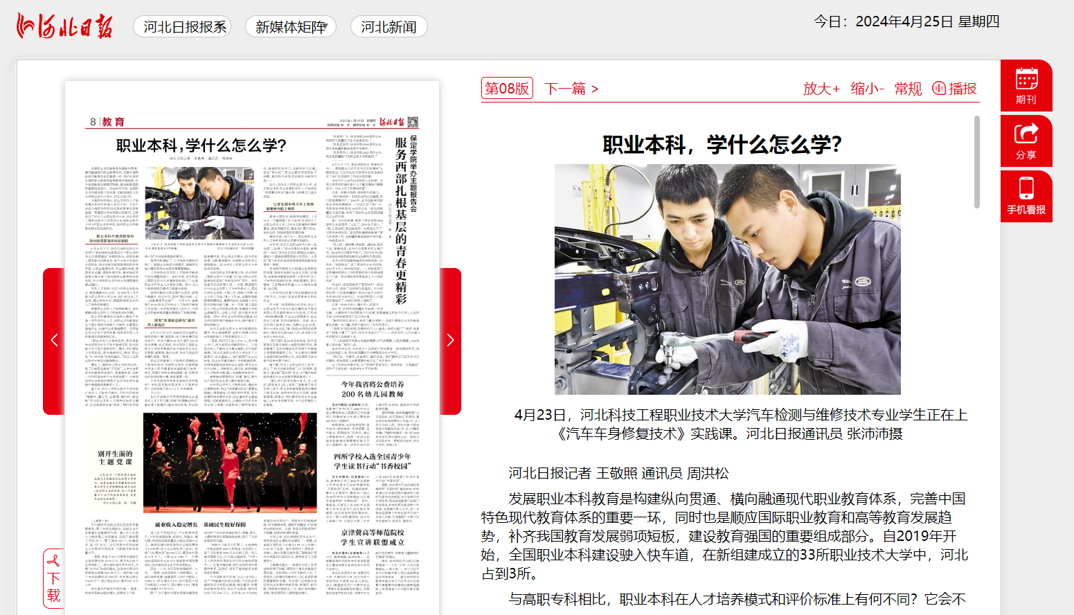 坚持对接河北和京津产业体系,坚持产教融合、校企合作,坚持“理论实践一比一、技能素质双主线”……今年1月,省教育厅出台《职业本科专业人才培养方案制订与实施工作的指导意见(试行)》,为职业本科教育高质量发展提供了制度保障。