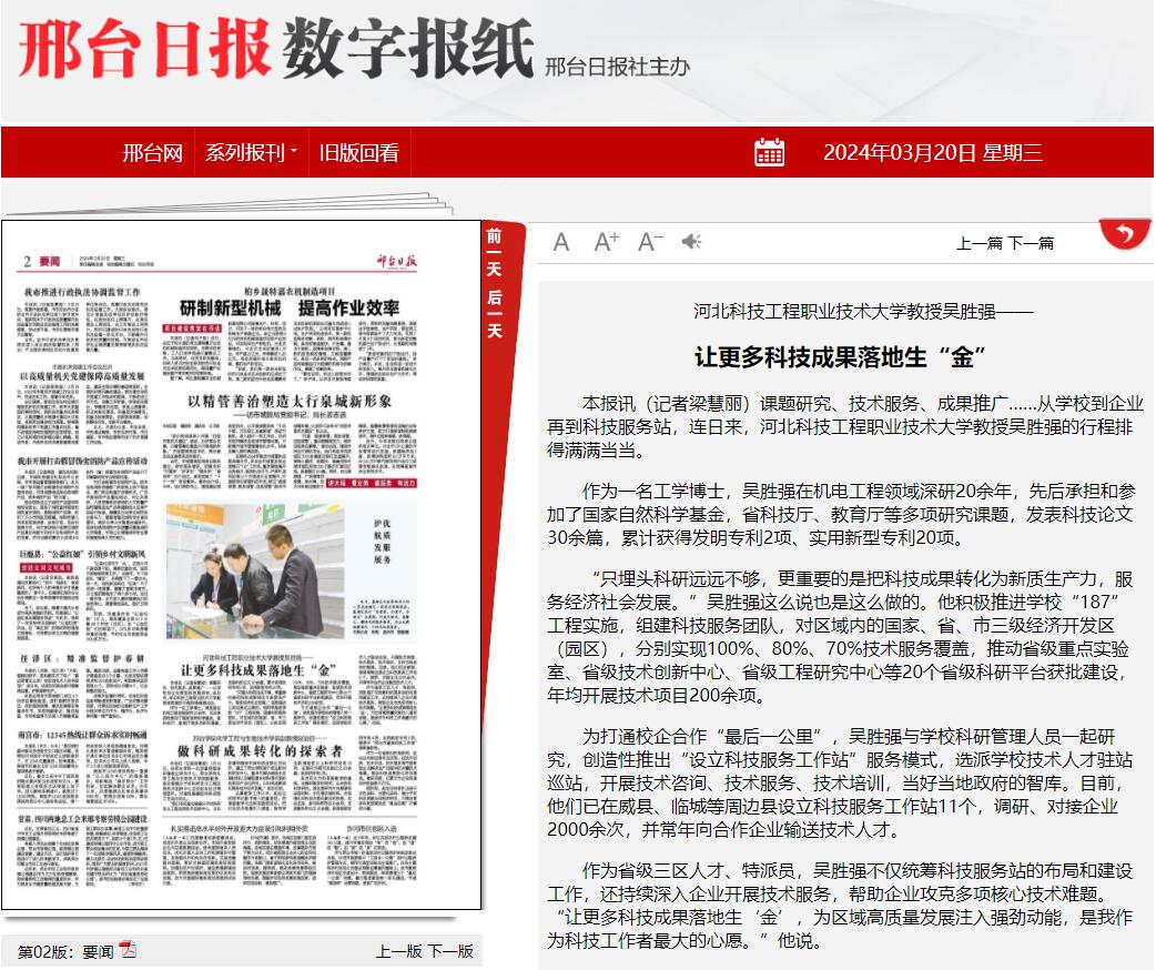 为打通校企合作“最后一公里”,吴胜强与学校科研管理人员一起研究,创造性推出“设立科技服务工作站”服务模式,选派学校技术人才驻站巡站,开展技术咨询、技术服务、技术培训,当好当地政府的智库。目前,他们已在威县、临城等周边县设立科技服务工作站11个,调研、对接企业2000余次,并常年向合作企业输送技术人才。