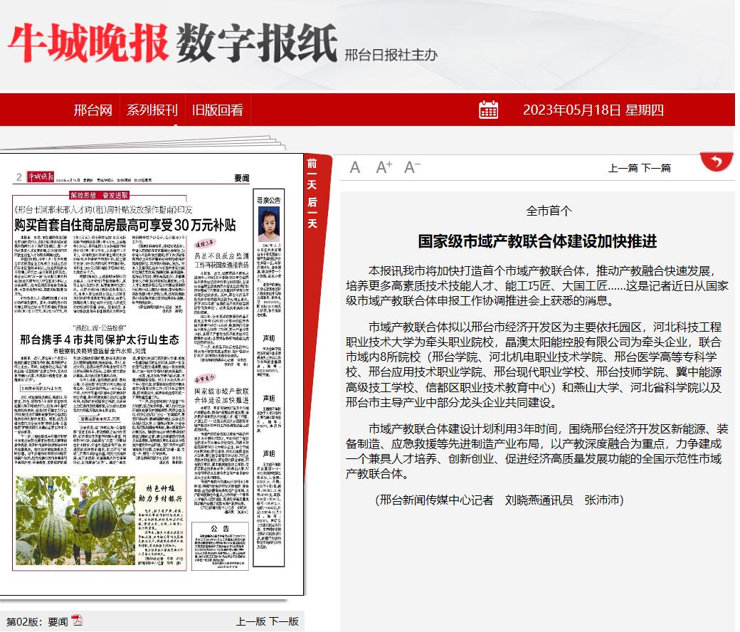 市域产教联合体拟以邢台市经济开发区为主要依托园区,365上市公司官网为牵头职业院校,晶澳太阳能控股有限公司为牵头企业,联合市域内8所院校(邢台学院、河北机电职业技术学院、邢台医学高等专科学校、邢台应用技术职业学院、邢台现代职业学校、邢台技师学院、冀中能源高级技工学校、信都区职业技术教育中心)和燕山大学、河北省科学院以及邢台市主导产业中部分龙头企业共同建设。
