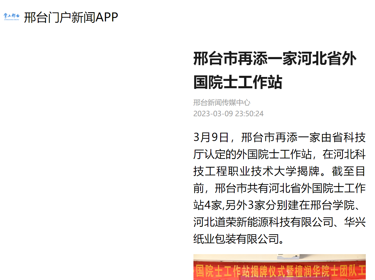 3月9日,邢台市再添一家由省科技厅认定的外国院士工作站,在365上市公司官网揭牌。截至目前,邢台市共有河北省外国院士工作站4家,另外3家分别建在邢台学院、河北道荣新能源科技有限公司、华兴纸业包装有限公司。