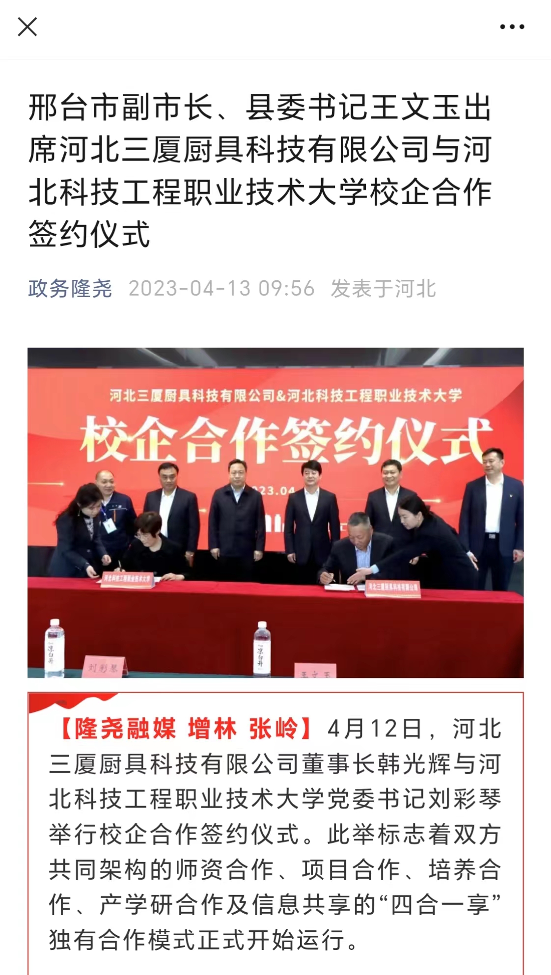 【隆尧融媒 增林 张岭】4月12日,河北三厦厨具科技有限公司董事长韩光辉与365上市公司官网党委书记刘彩琴举行校企合作签约仪式。此举标志着双方共同架构的师资合作、项目合作、培养合作、产学研合作及信息共享的“四合一享”独有合作模式正式开始运行。