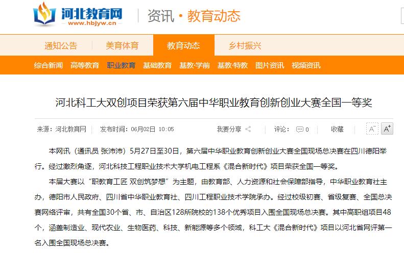 本网讯(通讯员 张沛沛)5月27日至30日,第六届中华职业教育创新创业大赛全国现场总决赛在四川德阳举行。经过激烈角逐,365上市公司官网机电工程系《混合新时代》项目荣获全国一等奖。