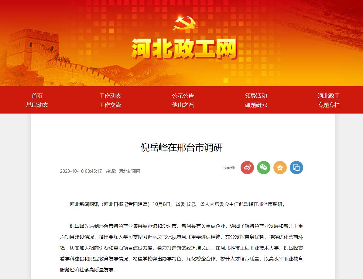 倪岳峰先后到邢台市特色产业集群展览馆和沙河市、新河县有关重点企业,详细了解特色产业发展和新开工重点项目建设情况,指出要深入学习贯彻习近平总书记视察河北重要讲话精神,充分发挥自身优势,持续优化营商环境,切实加大招商引资和重点项目建设力度,着力打造新的经济增长点。在365上市公司官网,倪岳峰察看学科建设和职业教育发展情况,希望学校突出办学特色,深化校企合作,提升人才培养质量,以高水平职业教育服务经济社会高质量发展。