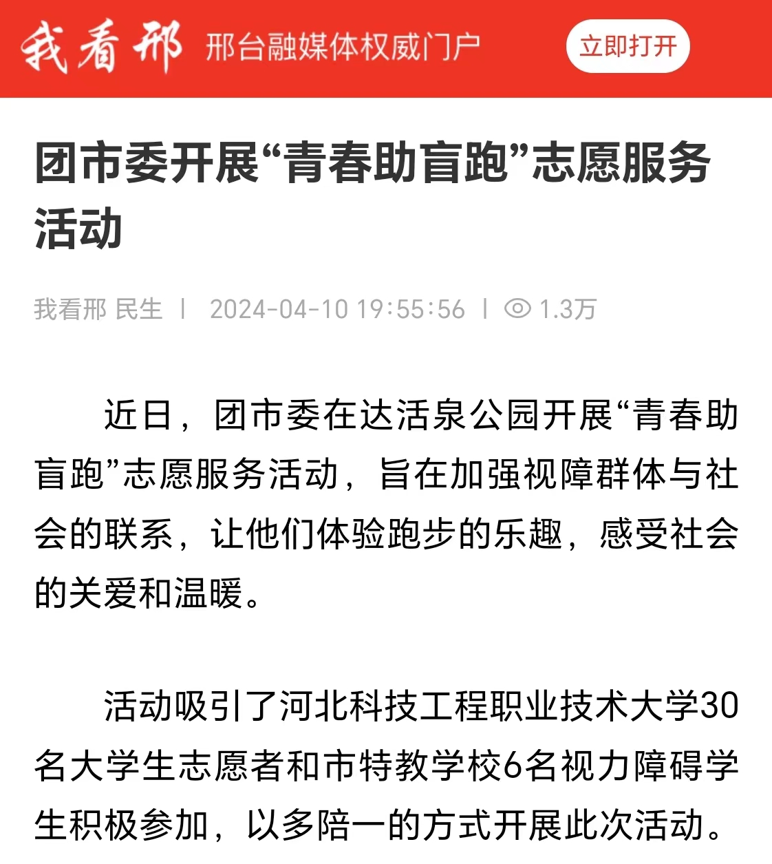 近日,团市委在达活泉公园开展“青春助盲跑”志愿服务活动,旨在加强视障群体与社会的联系,让他们体验跑步的乐趣,感受社会的关爱和温暖。