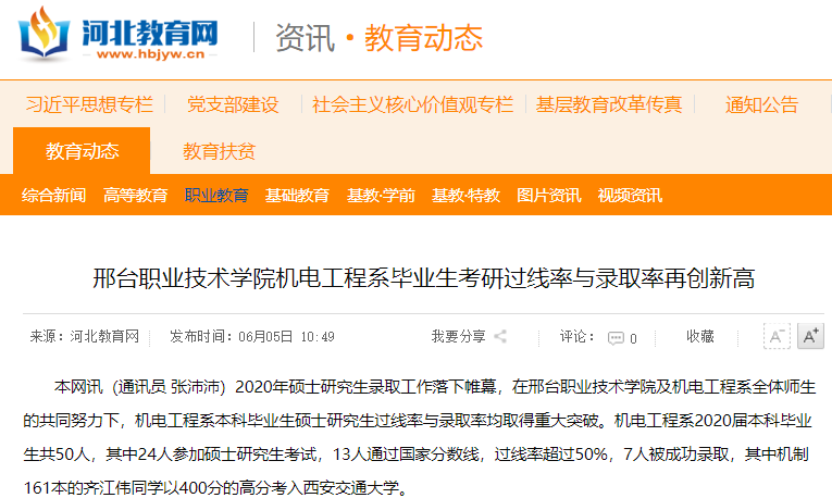 本网讯(通讯员 张沛沛)2020年硕士研究生录取工作落下帷幕,在邢台职业技术学院及机电工程系全体师生的共同努力下,机电工程系本科毕业生硕士研究生过线率与录取率均取得重大突破。机电工程系2020届本科毕业生共50人,其中24人参加硕士研究生考试,13人通过国家分数线,过线率超过50%,7人被成功录取,其中机制161本的齐江伟同学以400分的高分考入西安交通大学。