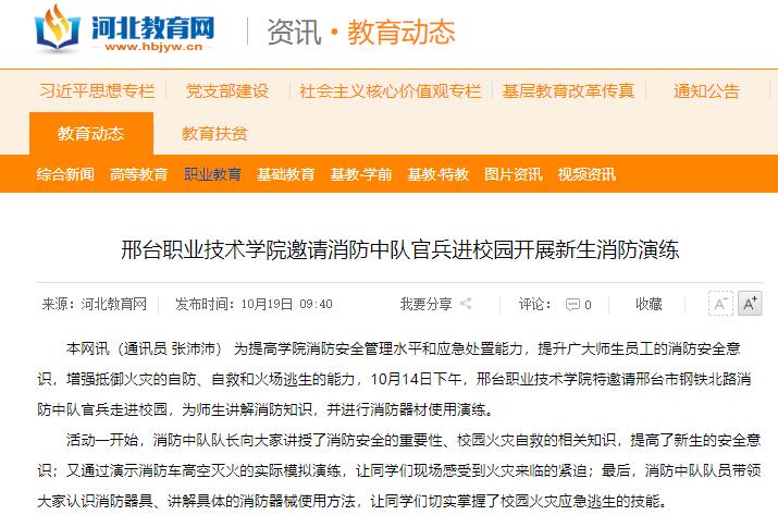 本网讯(通讯员 张沛沛) 为提高学院消防安全管理水平和应急处置能力,提升广大师生员工的消防安全意识,增强抵御火灾的自防、自救和火场逃生的能力,10月14日下午,邢台职业技术学院特邀请邢台市钢铁北路消防中队官兵走进校园,为师生讲解消防知识,并进行消防器材使用演练。