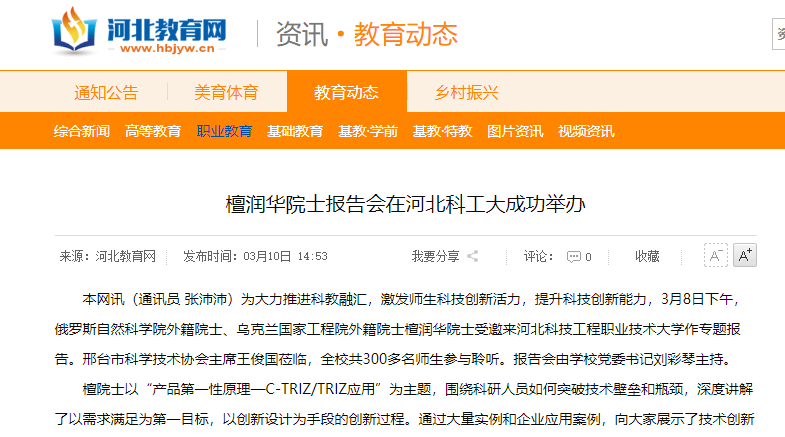 檀院士的报告进一步指导了河北科工大师生将创新方法应用到科研项目、技术服务项目中,对学校创新人才培养、高校教师创新能力提升具有极大的指导和参考价值,助力学校为科技创新和服务企业创新发展作出更大贡献。