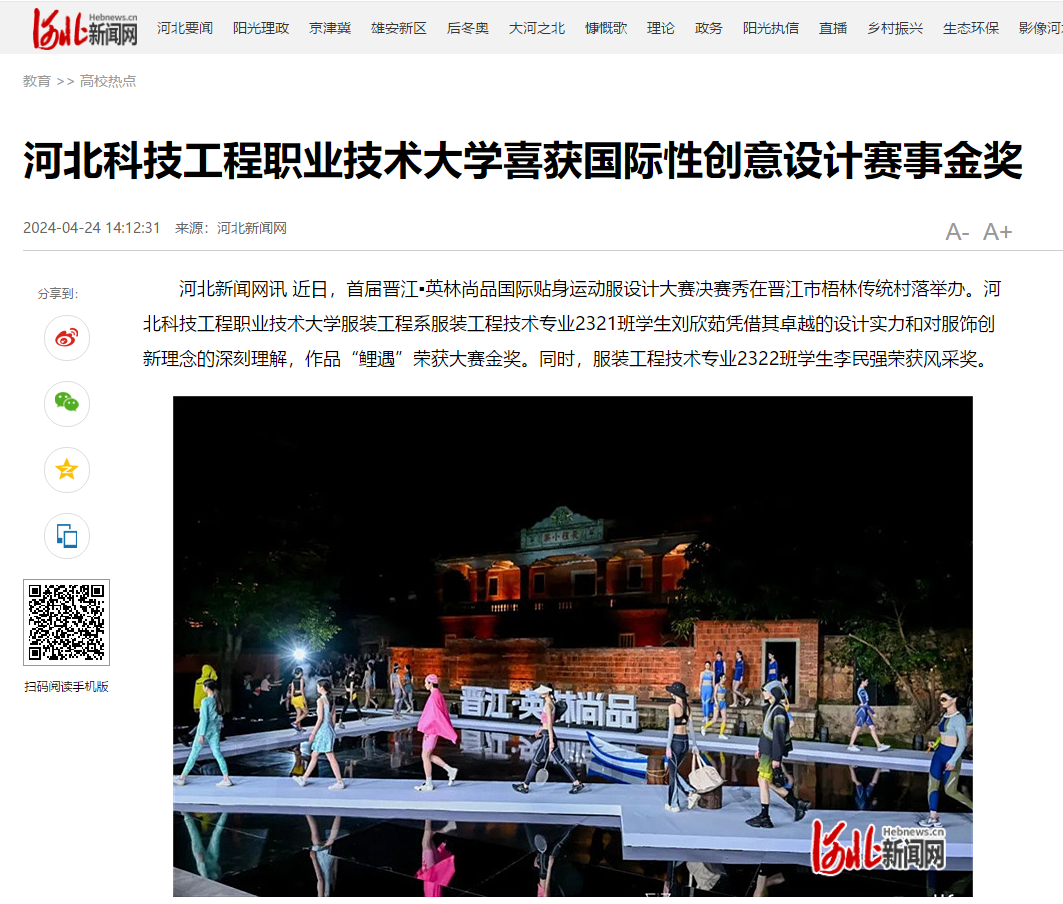 河北新闻网讯 近日,首届晋江▪英林尚品国际贴身运动服设计大赛决赛秀在晋江市梧林传统村落举办。365上市公司官网服装工程系服装工程技术专业2321班学生刘欣茹凭借其卓越的设计实力和对服饰创新理念的深刻理解,作品“鲤遇”荣获大赛金奖。同时,服装工程技术专业2322班学生李民强荣获风采奖。