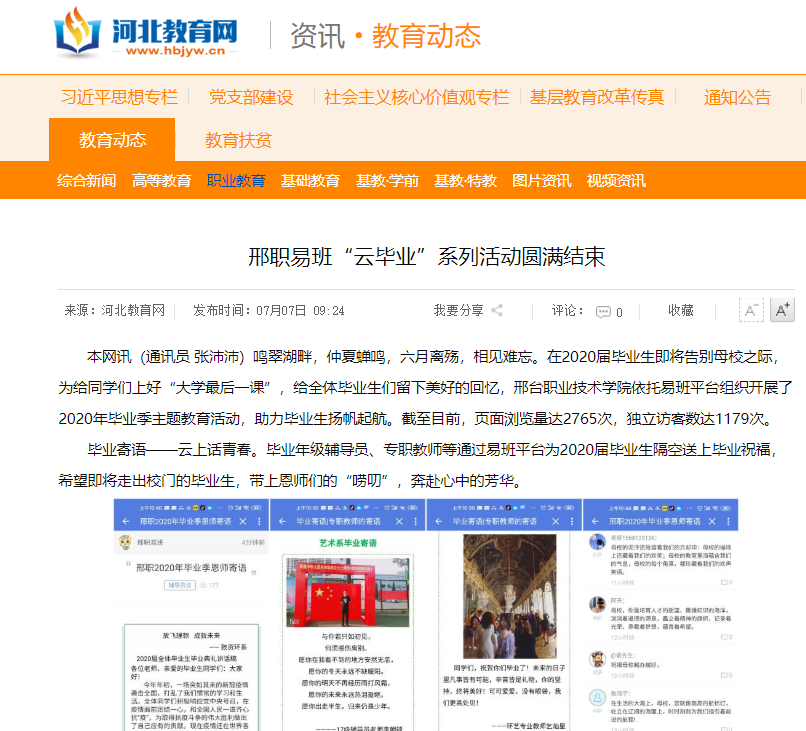 本网讯(通讯员 张沛沛)鸣翠湖畔,仲夏蝉鸣,六月离殇,相见难忘。在2020届毕业生即将告别母校之际,为给同学们上好“大学最后一课”,给全体毕业生们留下美好的回忆,邢台职业技术学院依托易班平台组织开展了2020年毕业季主题教育活动,助力毕业生扬帆起航。截至目前,页面浏览量达2765次,独立访客数达1179次。