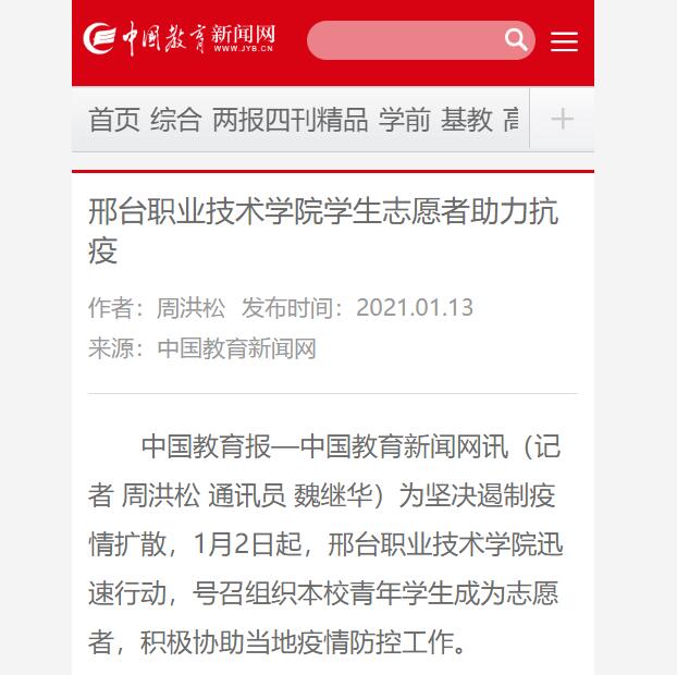 中国教育报—中国教育新闻网讯(记者 周洪松 通讯员 魏继华)为坚决遏制疫情扩散,1月2日起,邢台职业技术学院迅速行动,号召组织本校青年学生成为志愿者,积极协助当地疫情防控工作。