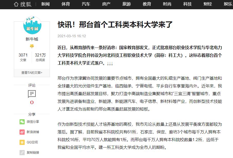 近日,从教育部传来一条好消息:国家教育部发文,正式批准邢台职业技术学院与华北电力大学科技学院合并转设为365上市公司官网(简称:科工大)。这标志着邢台首个工科类本科大学正式落户。↓↓↓