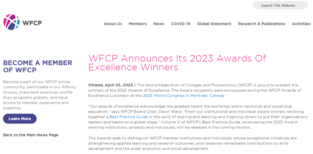 据悉,世界职教院校联盟成立于1999年,由62个国家和地区的职业教育组织与院校、应用技术大学组成,被誉为“世界职教领域最权威组织”。“WFCP卓越奖”于2014年设立,每两年评选一次,旨在表彰世界各国在相应领域成就突出、表现优异的院校及个人,宣传推广其优秀实践经验。