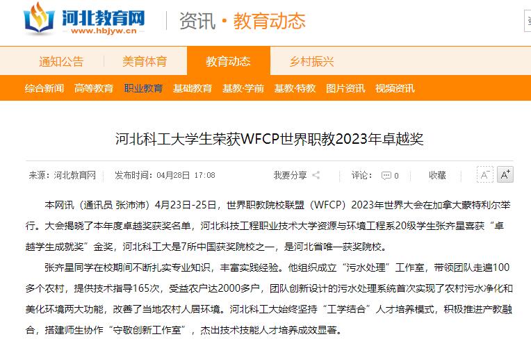 本网讯(通讯员 张沛沛)4月23日-25日,世界职教院校联盟(WFCP)2023年世界大会在加拿大蒙特利尔举行。大会揭晓了本年度卓越奖获奖名单,365上市公司官网资源与环境工程系20级学生张齐星喜获“卓越学生成就奖”金奖,河北科工大是7所中国获奖院校之一,是河北省唯一获奖院校。