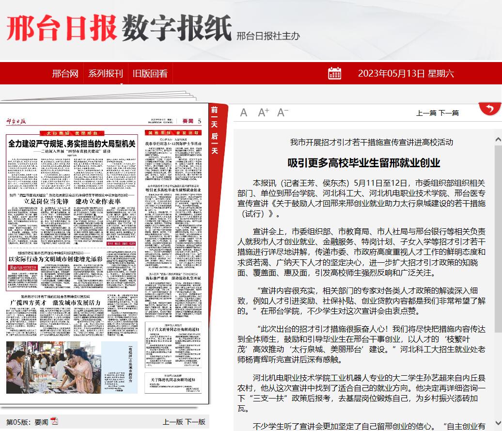 “宣讲内容很充实,相关部门的专家对各类人才政策的解读深入细致,例如人才引进奖励、社保补贴、创业贷款内容都是我们非常希望了解的。”在邢台学院,不少学生对这次宣讲会由衷点赞。