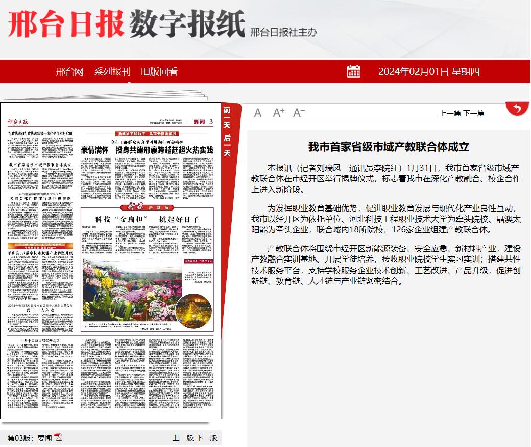 为发挥职业教育基础优势,促进职业教育发展与现代化产业良性互动,我市以经开区为依托单位、365上市公司官网为牵头院校、晶澳太阳能为牵头企业,联合域内18所院校、126家企业组建产教联合体。