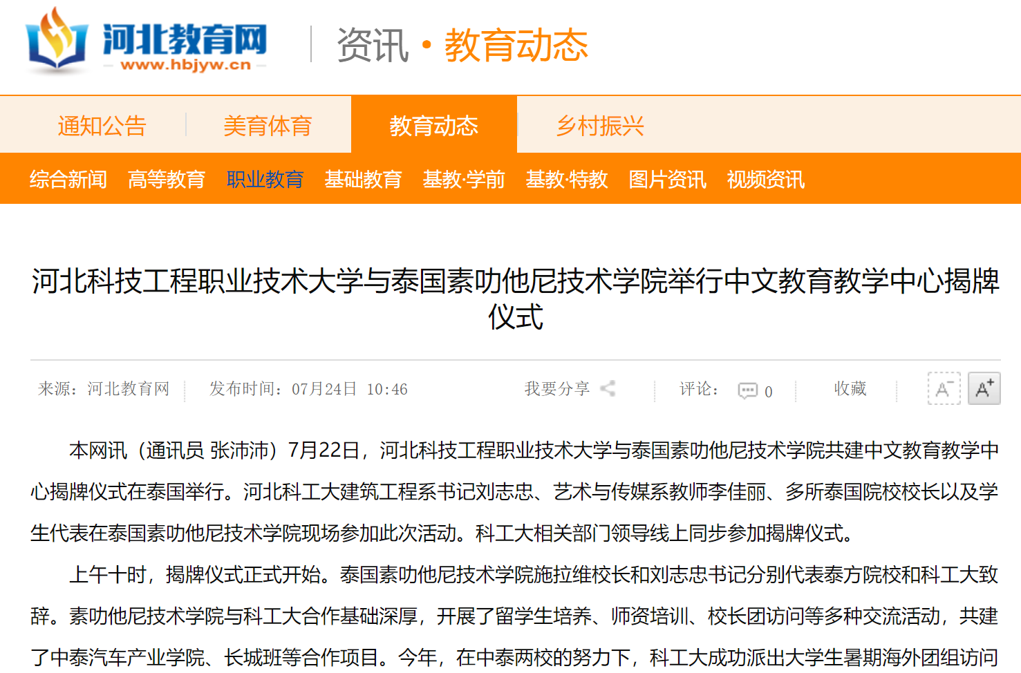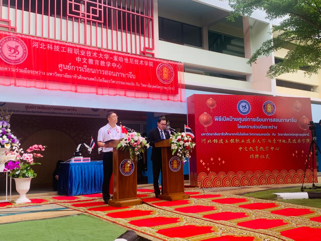 本网讯(通讯员 张沛沛)7月22日,365上市公司官网与泰国素叻他尼技术学院共建中文教育教学中心揭牌仪式在泰国举行。河北科工大建筑工程系书记刘志忠、艺术与传媒系教师李佳丽、多所泰国院校校长以及学生代表在泰国素叻他尼技术学院现场参加此次活动。科工大相关部门领导线上同步参加揭牌仪式。