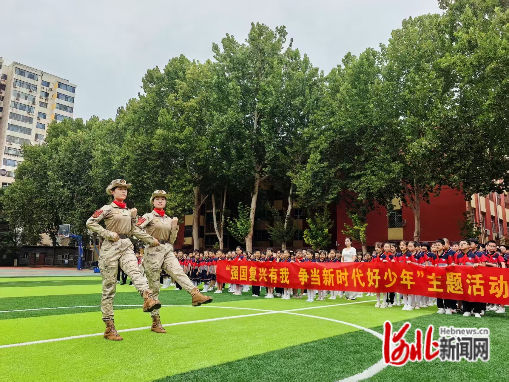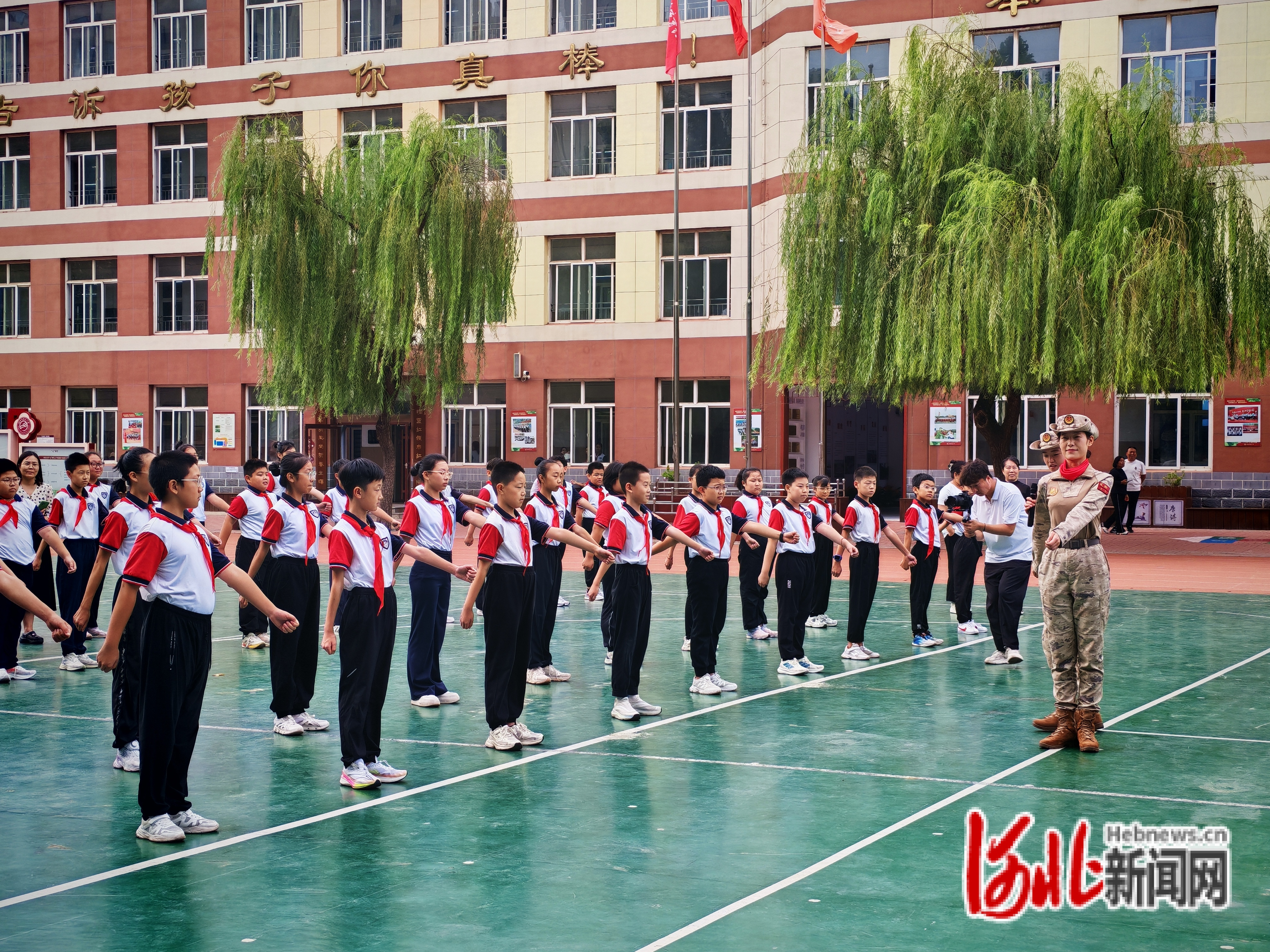 在郭守敬小学操场上,受阅女民兵队列展示震撼全场。随着整齐的口令声,她们迈着铿锵有力的正步,动作标准、转身利落,挺拔的身姿与飒爽的姿态赢得师生阵阵欢呼,让大家近距离感受到军人的过硬素质与国防力量的强大。