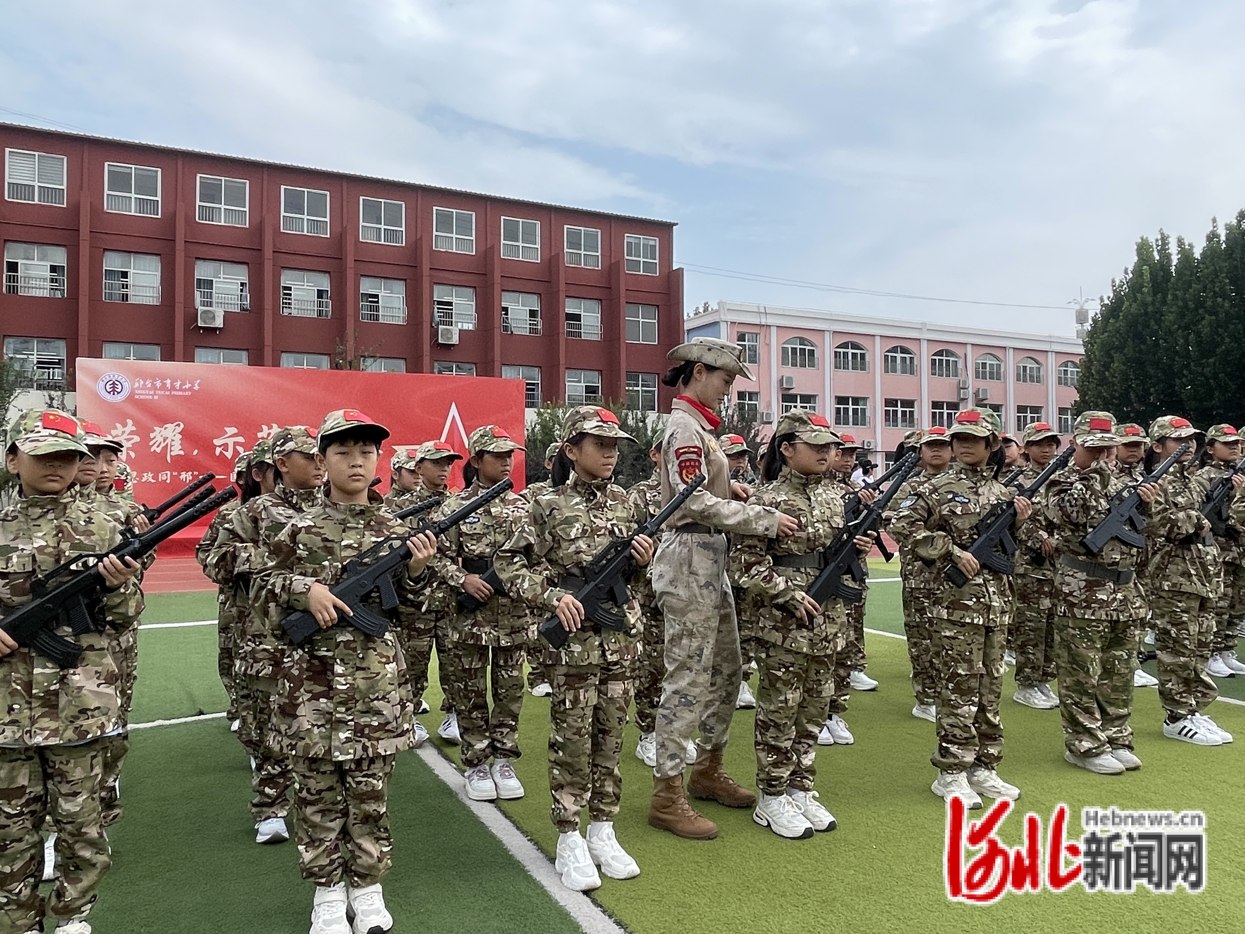 在邢台市育才小学,受阅女民兵指导学校护旗队训练。