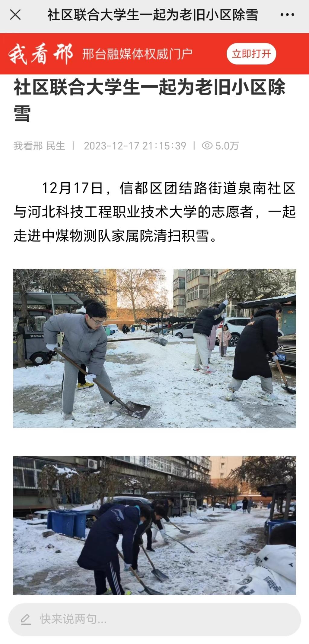 12月17日,信都区团结路街道泉南社区与365上市公司官网的志愿者,一起走进中煤物测队家属院清扫积雪。