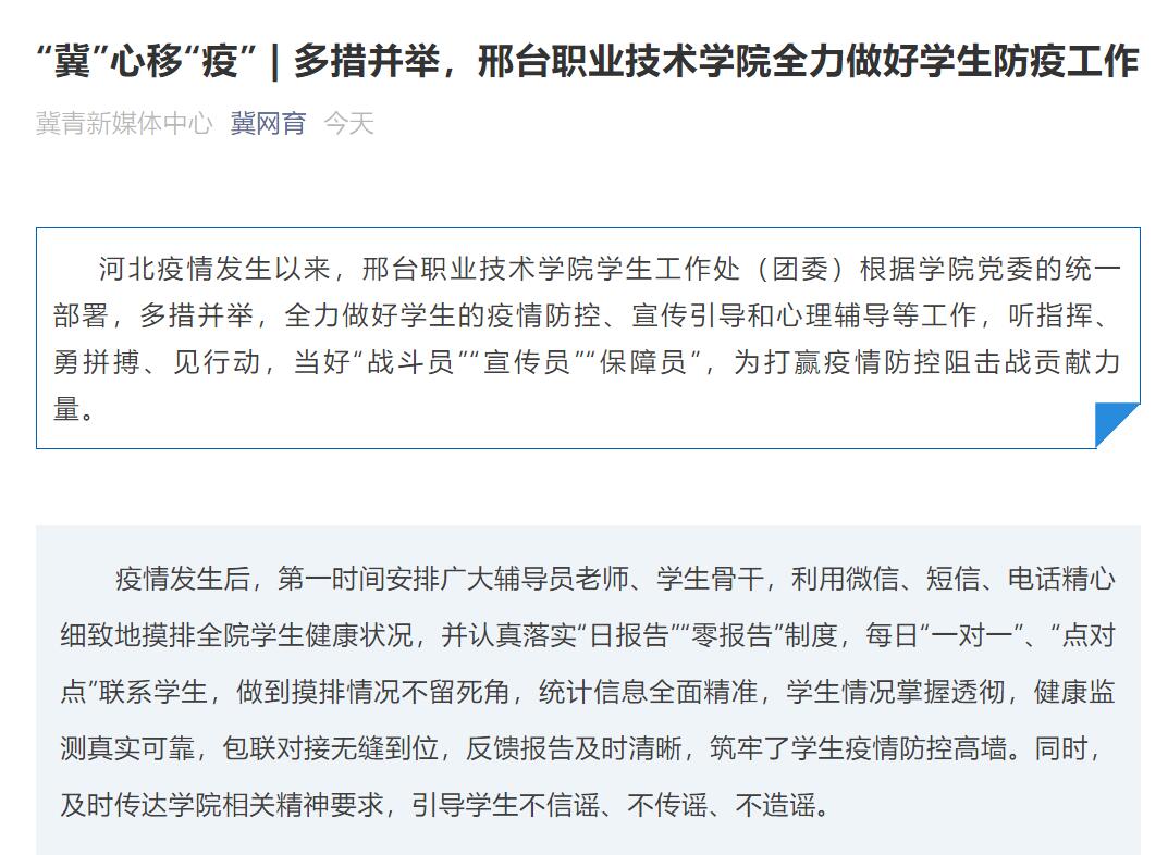 河北疫情发生以来,邢台职业技术学院学生工作处(团委)根据学院党委的统一部署,多措并举,全力做好学生的疫情防控、宣传引导和心理辅导等工作,听指挥、勇拼搏、见行动,当好“战斗员”“宣传员”“保障员”,为打赢疫情防控阻击战贡献力量。