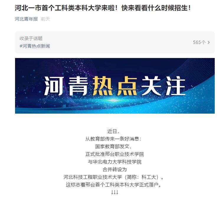 去年5月,教育部印发《关于加快推进独立学院转设工作的实施方案》,要求按照“能转尽转、能转快转”原则,加快推进独立学院转设工作,鼓励探索与高职高专合并的转设路径。这一政策为邢台市职业教育高质量发展带来了机遇。