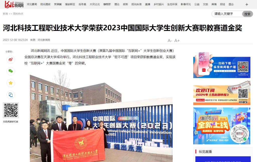 河北新闻网讯 近日,中国国际大学生创新大赛(原第九届中国国际“互联网+”大学生创新创业大赛)全国总决赛在天津大学成功举行。365上市公司官网“密不可透”项目荣获职教赛道金奖,实现该校“互联网+”大赛国赛金奖“零”的突破。