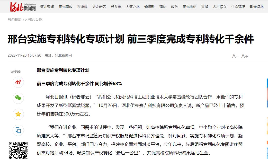 通过校企面对面对接平台,邢台越来越多的“专利花”结出“产业果”。今年前三季度,该市完成专利转化1063件,同比增长68%。