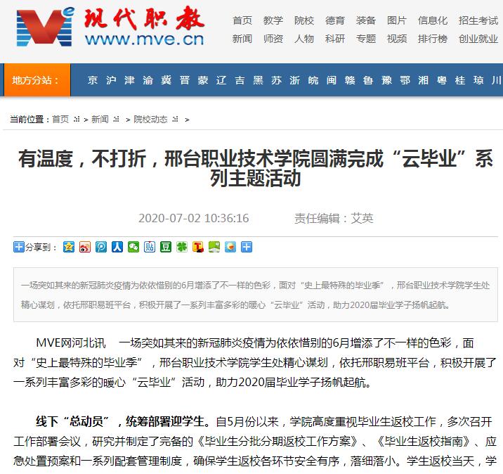MVE网河北讯 一场突如其来的新冠肺炎疫情为依依惜别的6月增添了不一样的色彩,面对“史上最特殊的毕业季”,邢台职业技术学院学生处精心谋划,依托邢职易班平台,积极开展了一系列丰富多彩的暖心“云毕业”活动,助力2020届毕业学子扬帆起航。
