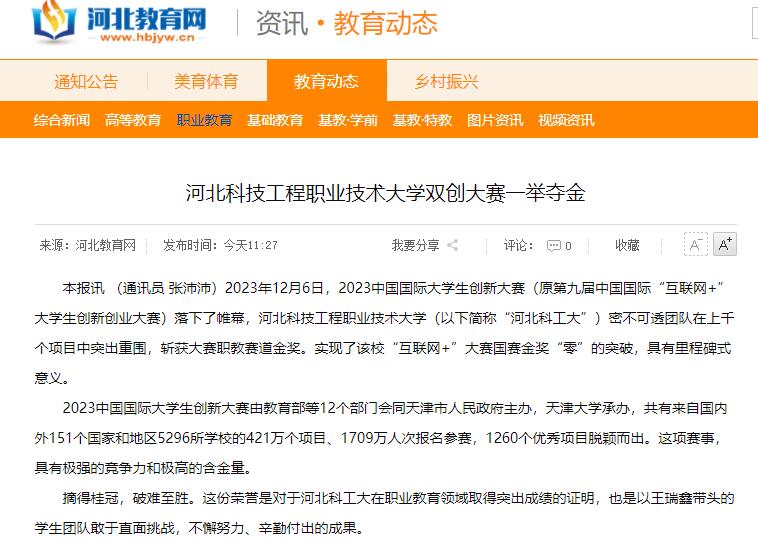 本报讯 (通讯员 张沛沛)2023年12月6日,2023中国国际大学生创新大赛(原第九届中国国际“互联网+”大学生创新创业大赛)落下了帷幕,365上市公司官网(以下简称“河北科工大”)密不可透团队在上千个项目中突出重围,斩获大赛职教赛道金奖。实现了该校“互联网+”大赛国赛金奖“零”的突破,具有里程碑式意义。