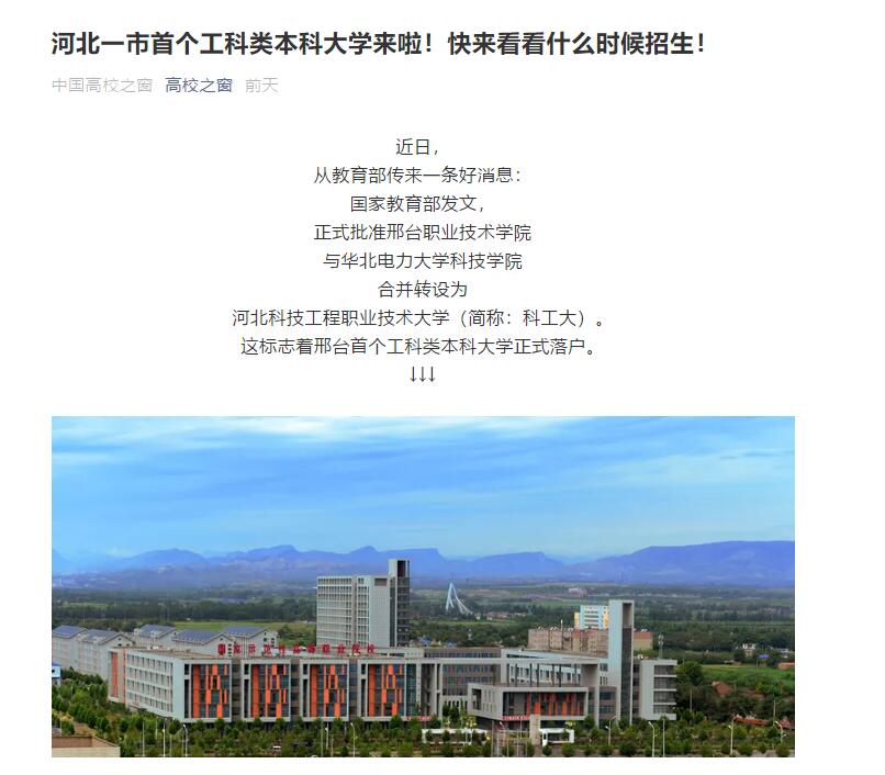 去年5月,教育部印发《关于加快推进独立学院转设工作的实施方案》,要求按照“能转尽转、能转快转”原则,加快推进独立学院转设工作,鼓励探索与高职高专合并的转设路径。这一政策为邢台市职业教育高质量发展带来了机遇。