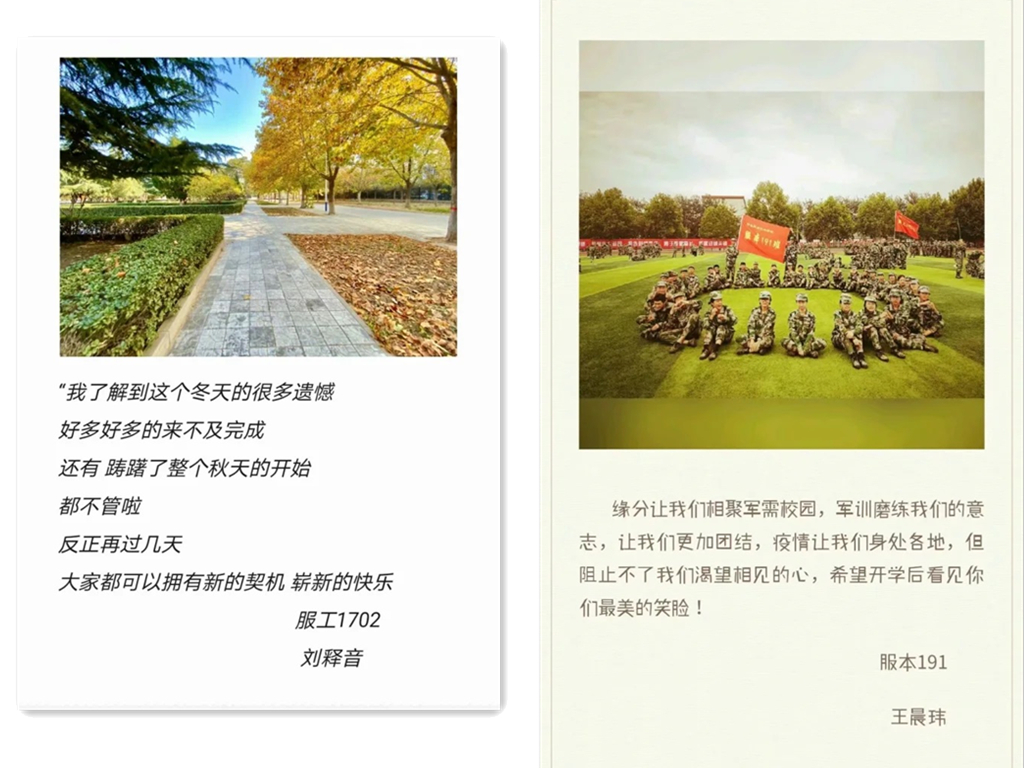 “校园记忆”活动推出以来,同学们纷纷寻找自己手里的摄影存货,踊跃投稿。100余张摄影作品,角度新颖,内容丰富,有一年四季的校园美景,有轻松愉悦的校园生活,有深沉厚重的军需文化......一张张照片展现出他们对学校浓浓的热爱和思念。最终,服工1902孙一雯等5位同学的作品点赞最多获得一等奖。