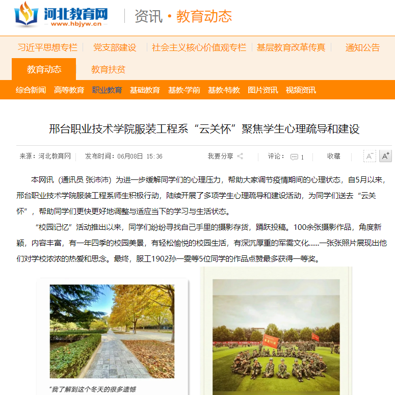 本网讯(通讯员 张沛沛)为进一步缓解同学们的心理压力,帮助大家调节疫情期间的心理状态,自5月以来,邢台职业技术学院服装工程系师生积极行动,陆续开展了多项学生心理疏导和建设活动,为同学们送去“云关怀”,帮助同学们更快更好地调整与适应当下的学习与生活状态。
